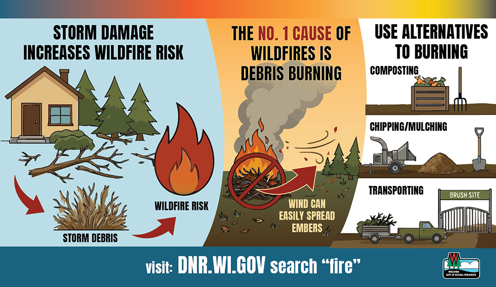 Storm debris can increase your wildfire risk. Burning this debris can also increase your wildfire risk. Think about alternatives to debris burning.